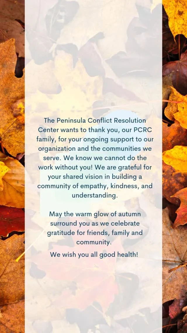 At the Peninsula Conflict Resolution Center (PCRC), we strive to create spaces where all perspectives are valued and individuals feel respected and included. We offer customized conflict resolution services tailored to your unique needs. From mediation and conflict coaching to training and facilitation, we help build stronger communication, foster collaboration, and create lasting harmony. Our expert team is here to guide you through challenges, empowering your organization and community with effective solutions that promote peace and understanding. Let us help you resolve conflicts and strengthen relationships.